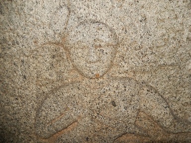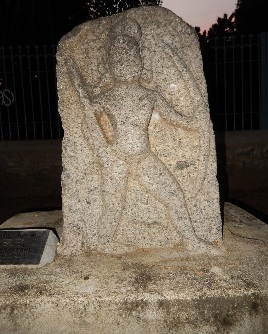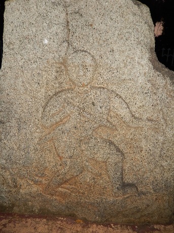 This hero stone is available at Manthralayam opposite to the Siva temple, where the soldier sports a short sword in the waist but uses a bow and arrow. There are also small figurines above the head – probably celestial creatures blessing the fallen hero.