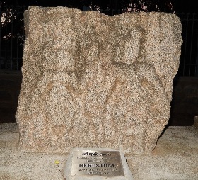 Hero stone (Virgal in Kannada, natukal in Tamil) is a memorial commemorating the honorable death of a hero in battle. Erected between the 3rd century BC and the 18th century AD, hero stones are found all over India. They often carry inscriptions displaying a variety of adornments, including bas relief panels, frieze, and figures on carved stone. Usually they are in the form of a stone monument and may have an inscription at the bottom with a narrative of the battle.