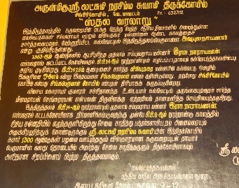 The various inscriptions on the north, south and western walls tell the history of the temple. Lord Vishnu depicted in the form of NARASIMHAN i.e. half man-half lion, is denoted as AVAPULANAYANAR..