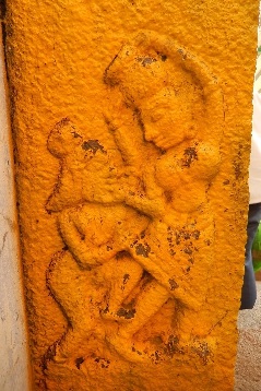 Probably a member of the from the royal family who built this shrine. This is a custom in most of the structures built by Nayaka kings where they are portrayed with folded hands greeting the worshippers. In several other shrines, they are seen along with their spouse as well.