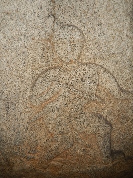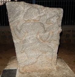 This hero stone is available at Manthralayam opposite to the Siva temple, where the soldier sports a short sword in the waist but uses a bow and arrow. There are also small figurines above the head – probably celestial creatures blessing the fallen hero.