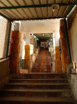 The stairway leading to the temple; halfway through, a four pillared mandapam is located .The pillars contain engraved figurines viz. human, animal and floral designs.