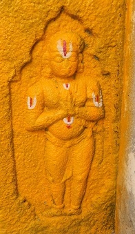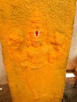 Lord Vishnu in a seated form along with the consort (an unusual way of depiction) where Hanuman is seen in standing posture (in reverence)