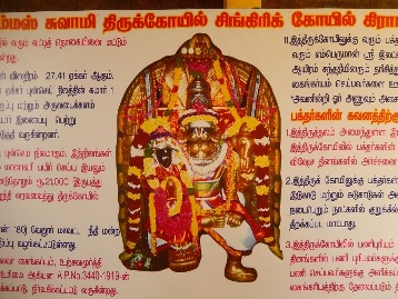 The Lord Vishnu is seen here as Singa Perumal with Sri Lakshmi Devi seated on the right side lap which is unique whereas in most of the SINGA PERUMAL Temple the Lord has His consort seated on the left side.